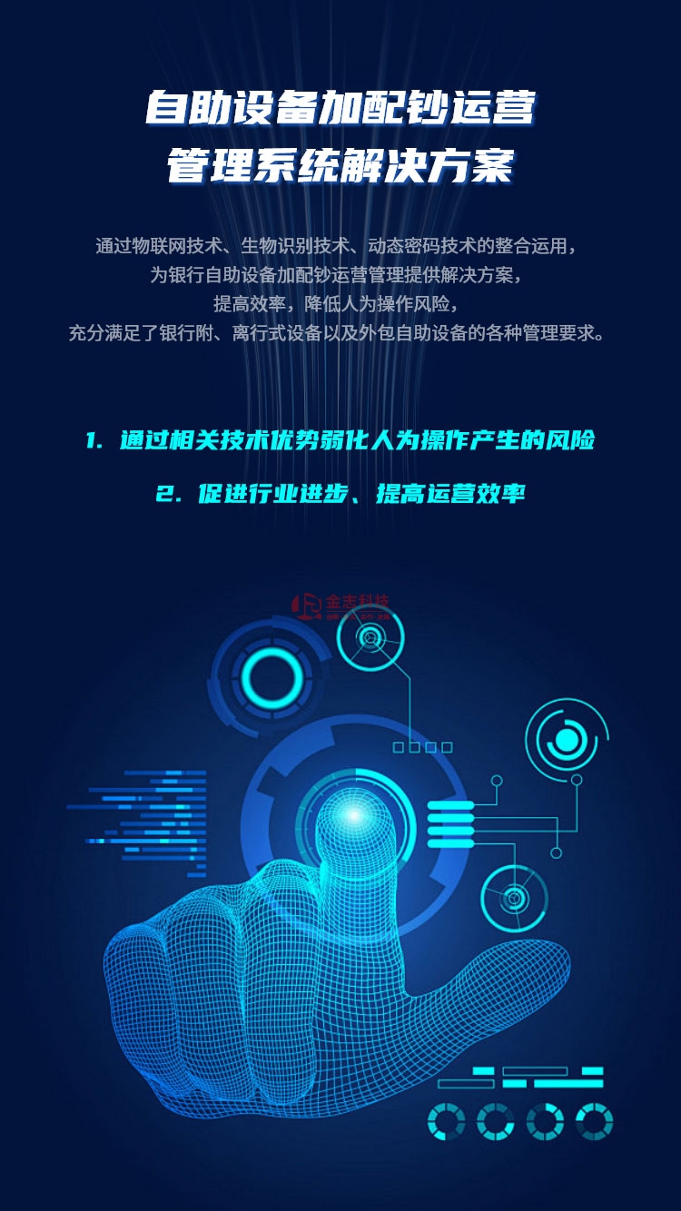 通過物聯網技術、生物識別技術、動態密碼技術的整合運用,為銀行自助設備加配鈔運營管理提供解決方案,提高效率,降低人為操作風險,充分滿足了銀行附、離行式設備以及外包自助設備的各種管理要求。
